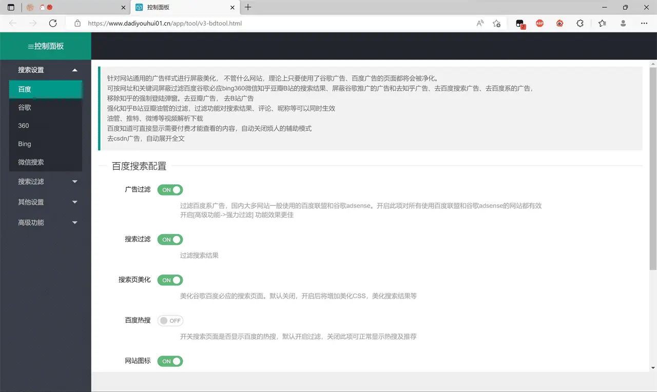 屏蔽谷歌广告、百度广告、知乎广告、隐藏谷歌和百度搜索增强百度搜索结果的各种广告等等(过滤所有采用谷歌联盟和百度联盟等广告联盟的广告),配合 Adblock Plus 基本可以做到无广告体验