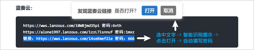 【网盘智能识别助手】可以智能识别鼠标选中区域里的🔗网盘链接和🔑提取码,识别成功弹出提示,点击“打开”跳转网盘页面,若包含提取码则自动填写。