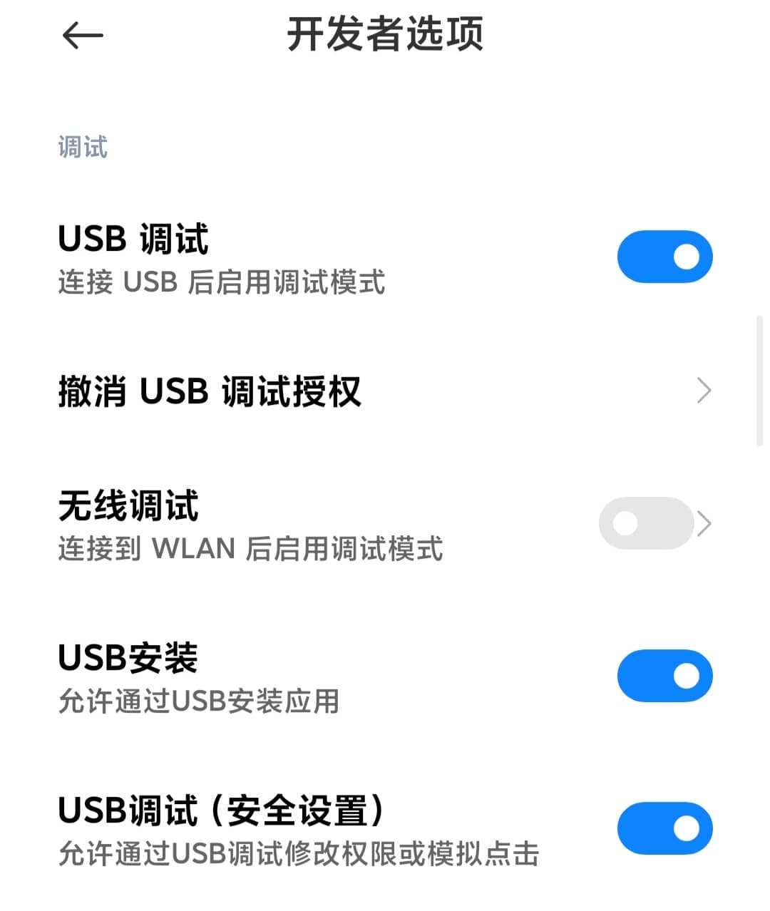 - 在开发者模式里面,开启 USB 调试、USB调试(安全设置)、USB安装这三个功能。