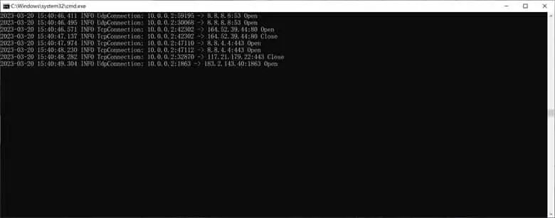在电脑上使用 Gnirehtet,你可以查看手机访问网络的记录,包括IP地址和端口。不过要注意,这个界面不能关闭,一旦关闭就会断开手机的共享网络连接。