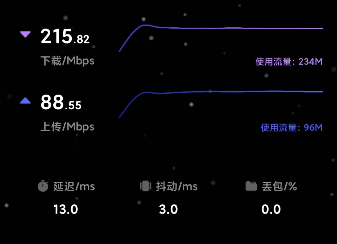 经过多次测试,手机使用数据线的方式上网,延迟还算挺稳定的,一直在 13/ms 左右,抖动 3/ms。下载速度方面,在 200-300/Mbps 左右,上行速度 88/Mbps 左右。
