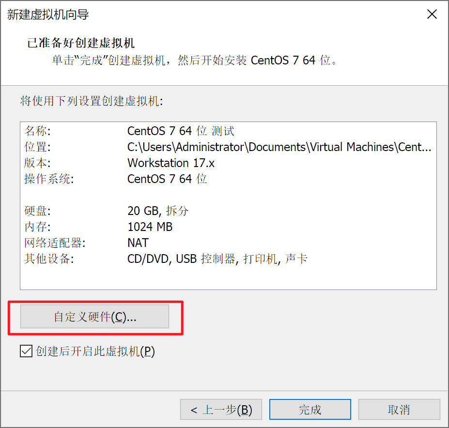 在自定义硬件中,我们可以再次配置虚拟机的内存、cpu等硬件属性,在当前Nginx学习阶段硬件配置不需要过高,默认单核cpu、1G内存即可。