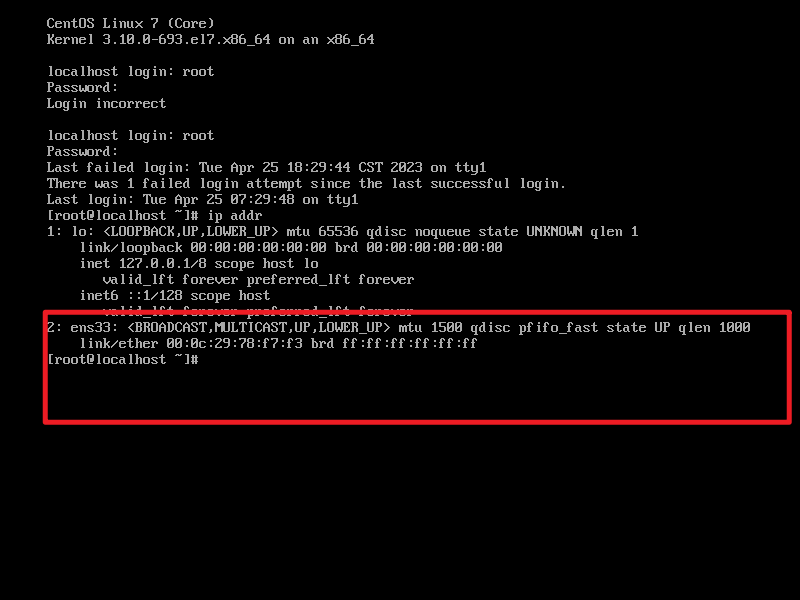 输入命令后我们可以看到这个网卡适配器的名字是ens33,可以稍微记一下