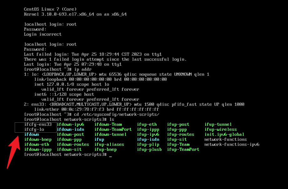 可以看到确实有刚才我们看到的ens33这个文件,还有另外一个lo,接下来呢就可以直接修改这个配置文件了