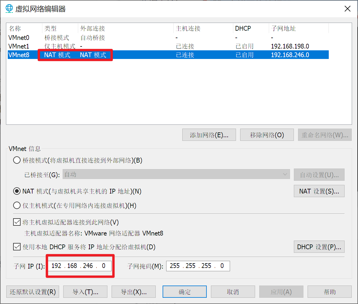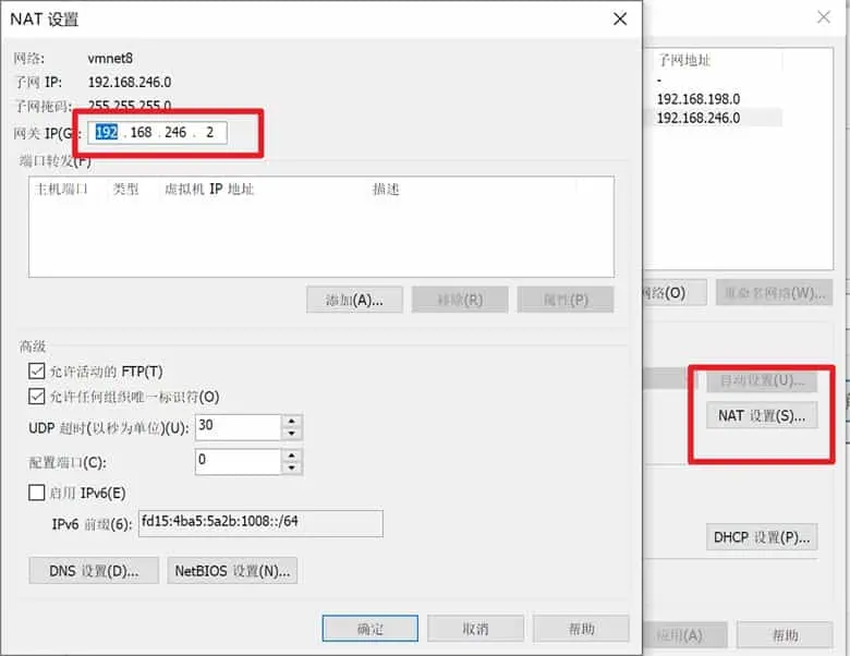 点击NAT 设置,可以看到网关(GATEWAY)是192.168.246.2