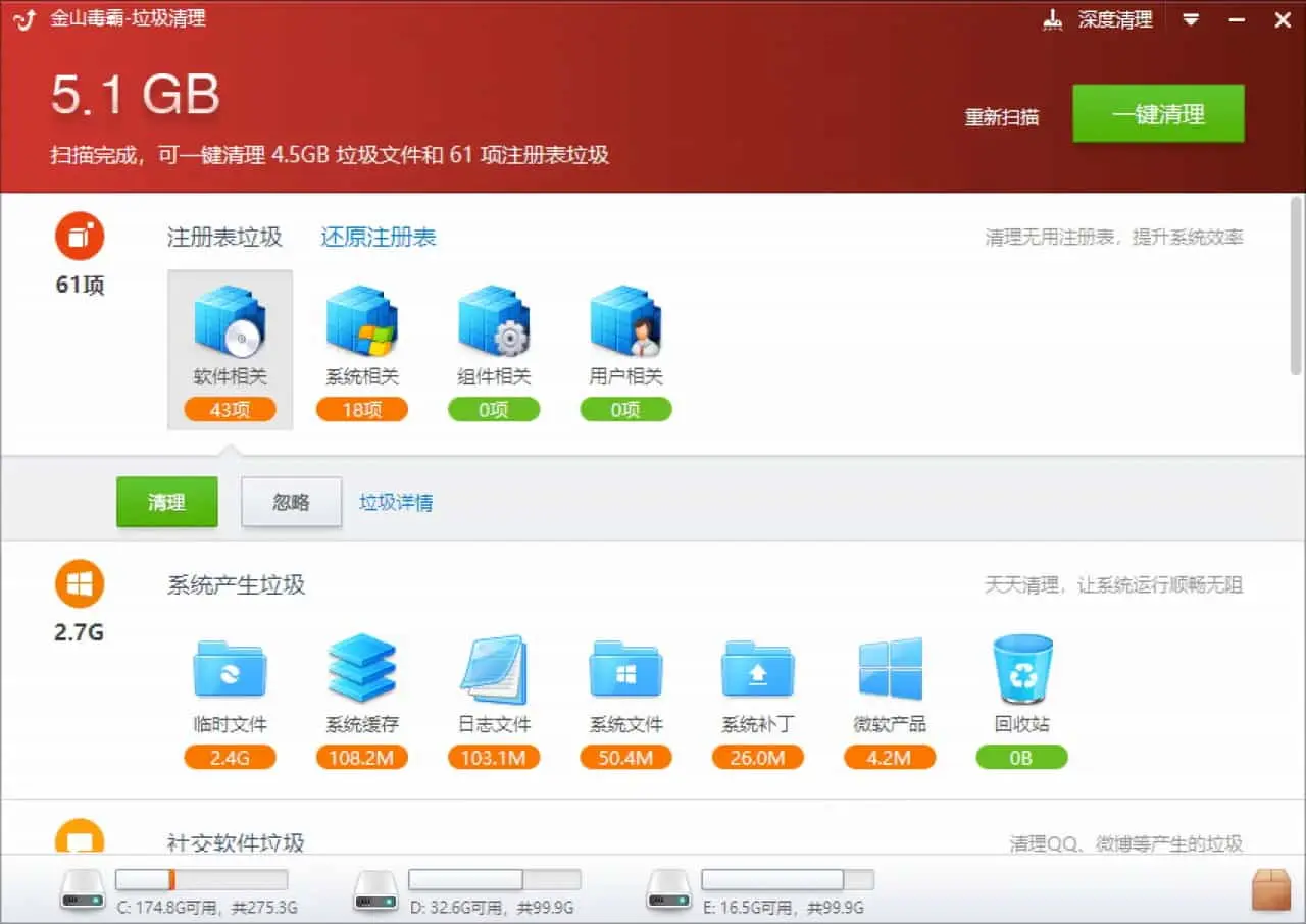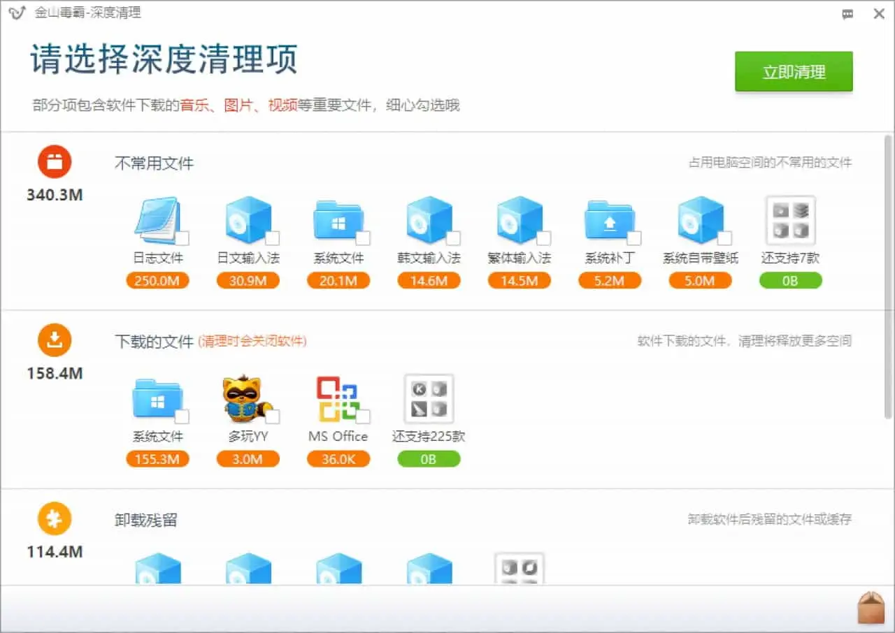 金山单清可以进行全面扫描,深度清理电脑中的垃圾文件,从而为用户的设备提供更快的体验。对于普通用户而言,日常的垃圾清理还得是快捷的金山单清。