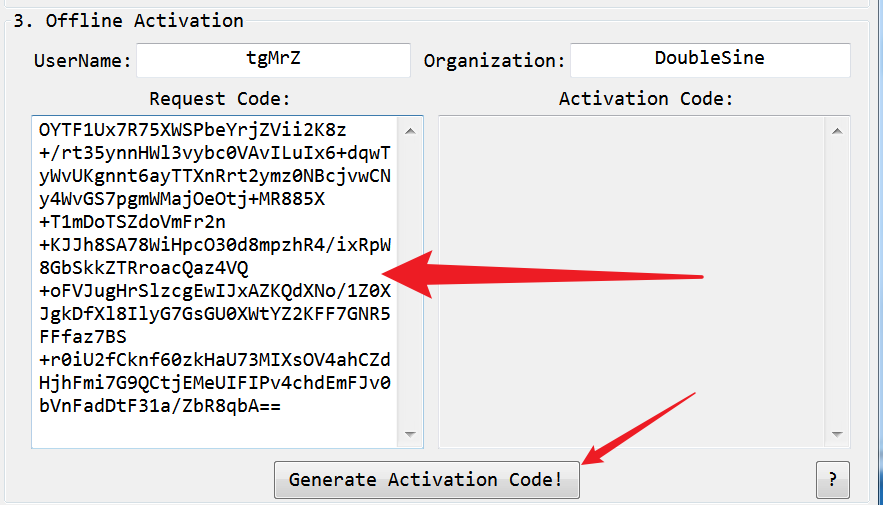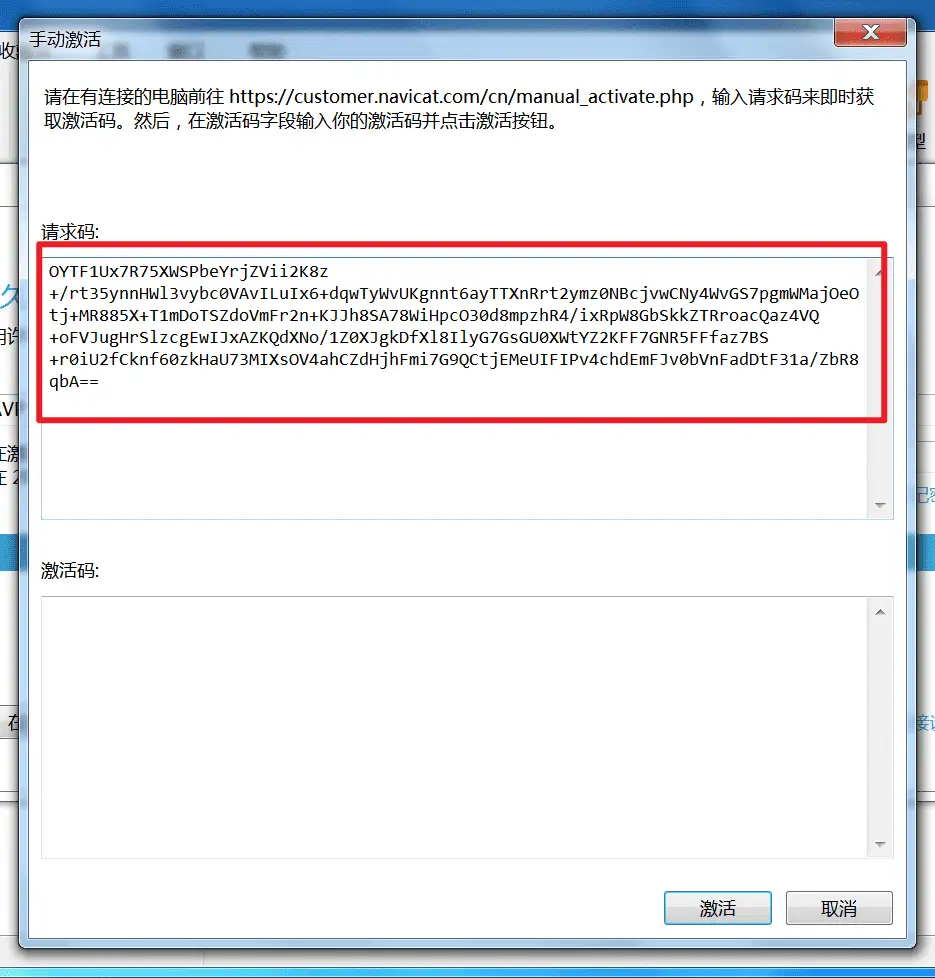 将 Navicat 给的请求码复制到注册机 Request Code 中,然后点击 Generate Activation Code 生成激活码