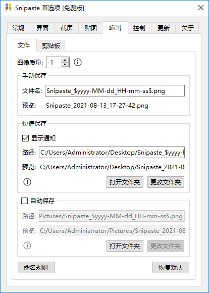 自定义保存路径 应用程序设置 > 路径 > 使用自定义截图文件夹