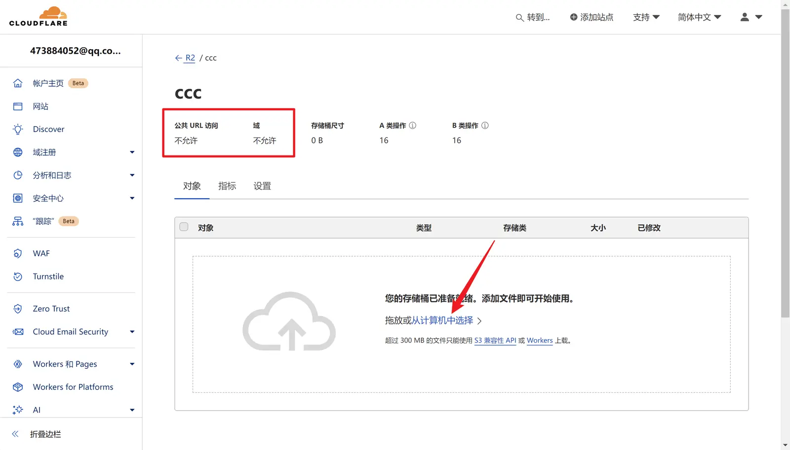 创建完成后,可以看到公共URL访问和域都是不允许的状态,但是这个时候是允许上传文件的。