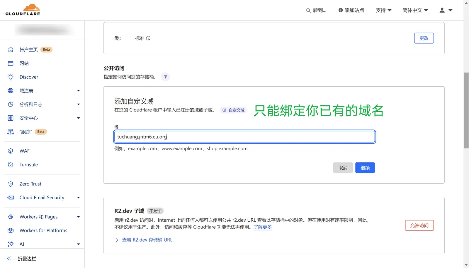 进入设置页面,在公开访问下找到添加自定义域,填写你在CloudFlare解析的域名,个人建议是使用一级域名作为存储桶的访问域,例如我的网站是jntm6.eu.org