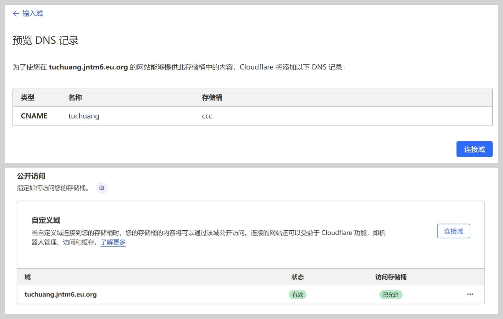 点击连接域,CloudFlare会在你的域名下添加一条新的DNS记录,点击连接域之后,你就可以通过该域名访问到存储桶的内容