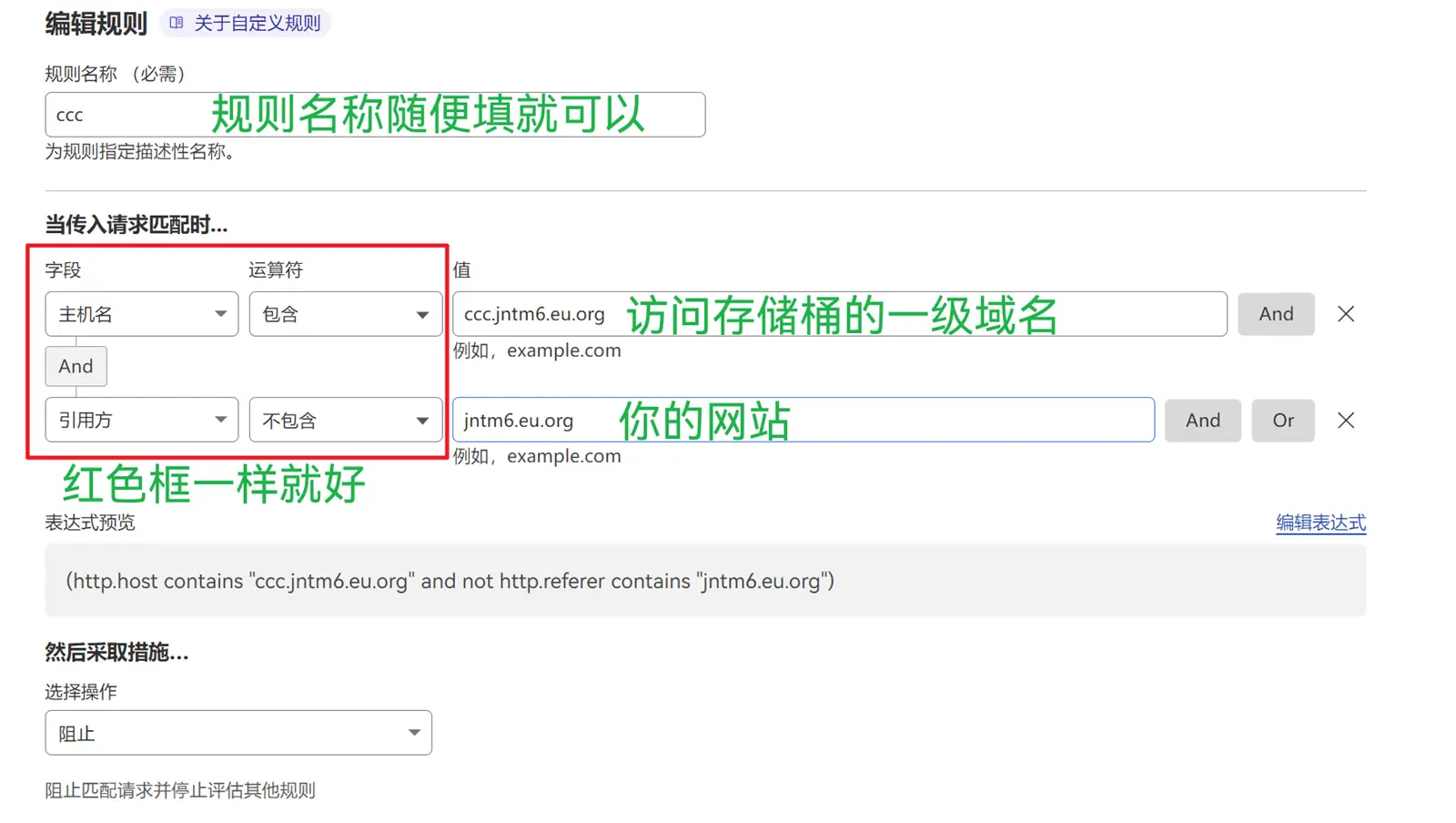 的内容,其他非法的请求都会被CloudFlare所屏蔽。注意!防盗规则仅能屏蔽链接到你存储对象的链接,并不能屏蔽浏览者通过正常访问网站并下载你的文件。
